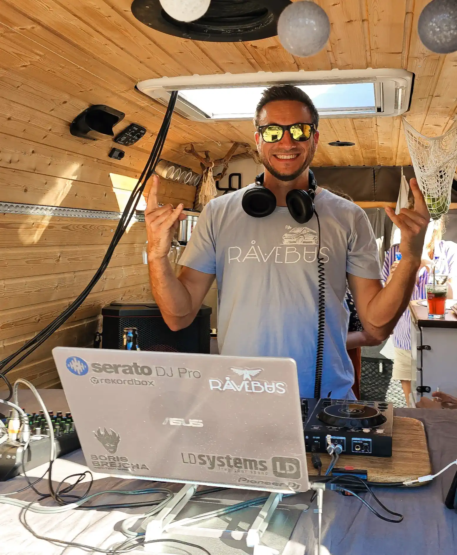 Der RaveBus ist ein von mir komplett selbst ausgebauter Mercedes Sprinter. Klar, er ist ein vollwertiger Camper mit allem, was man braucht – aber für mich ist er noch viel mehr. Er ist ein Stück von meinem Lebensgefühl. In ihm kann ich meine Musik leben: Entweder etwas lauter als DJ mit Mischpult und einer professionellen Soundanlage oder etwas ruhiger und gefühlvoll am Piano. Und er ist mein kleines mobiles Paradies für besondere Erlebnisse – zum Beispiel am Strand oder am Lagerfeuer Klavier spielen, bei Festivals auf dem Camping mit dem DJ-Setup die Stimmung anheizen oder oben auf der Dachterrasse den Sonnenuntergang genießen. Mit Freunden an meiner ausklappbaren Außentheke selbstgemachte Cocktails trinken, dazu Seifenblasen in den Himmel schicken – genau solche Momente sind es, die den RaveBus für mich so besonders machen.